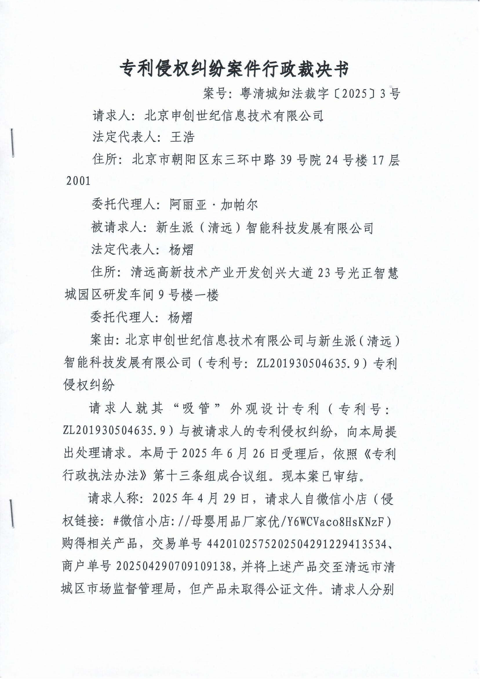 專利侵權(quán)糾紛案件行政裁決書(shū)(粵清城知法裁字〔2025〕3號(hào))
