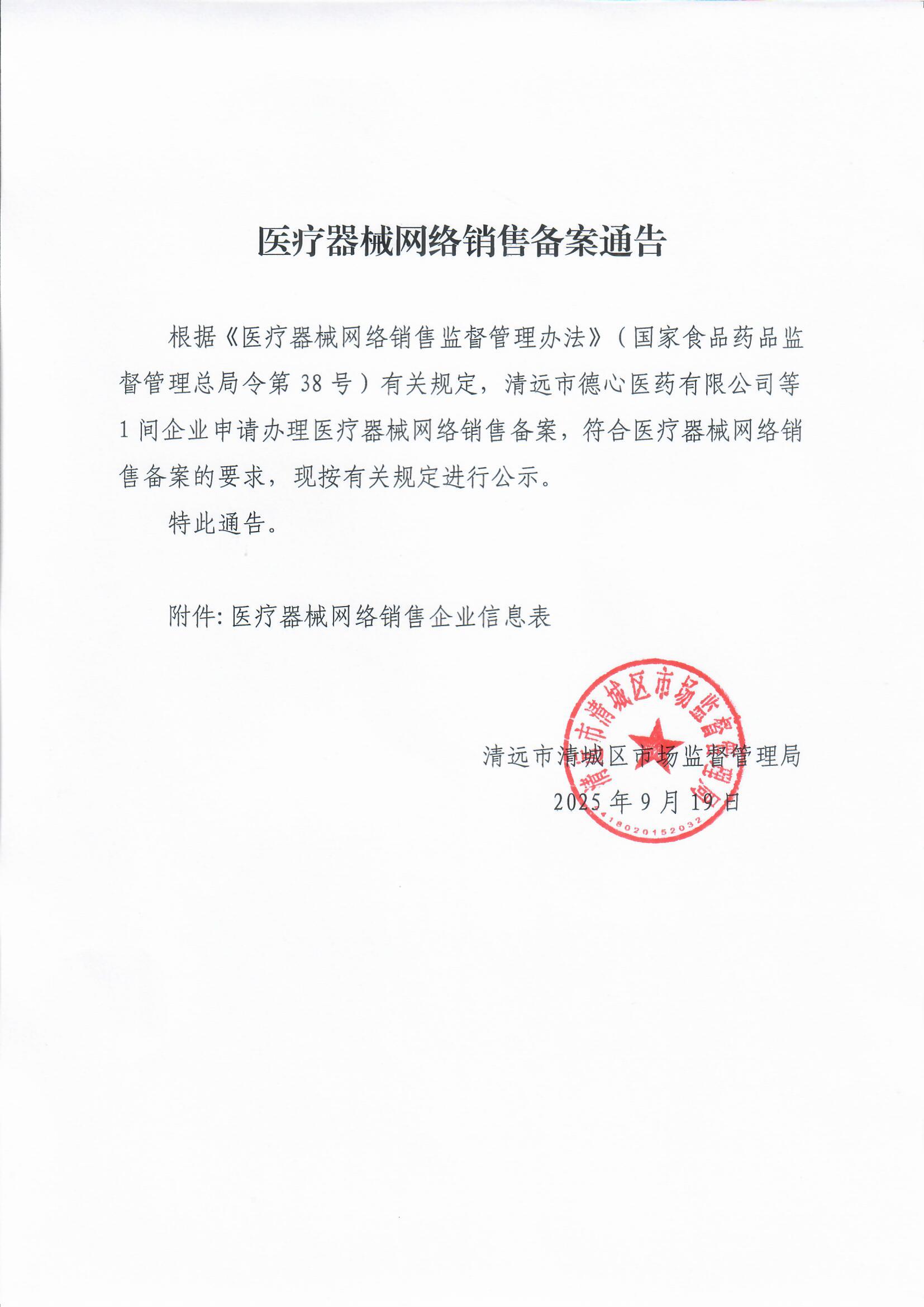 1 | 首次備案 | (清城)網(wǎng)械銷售備字 ﹝2025﹞第34號(hào) | 2025/9/11 | 清遠(yuǎn)市德心醫(yī)藥有限公司 | 入駐類 | 91441802MAE5BWQY8P | 清遠(yuǎn)市清城區(qū)城北二路西25座君華大廈首層商鋪02號(hào) | ****** | 美團(tuán)網(wǎng);拼多多商城 | (京)網(wǎng)械平臺(tái)備字(2018)第00004號(hào);(瀘)網(wǎng)械平臺(tái)備字[2018]第00003號(hào) | 無 | 無 | 無 | 無 | 無 | 無 |