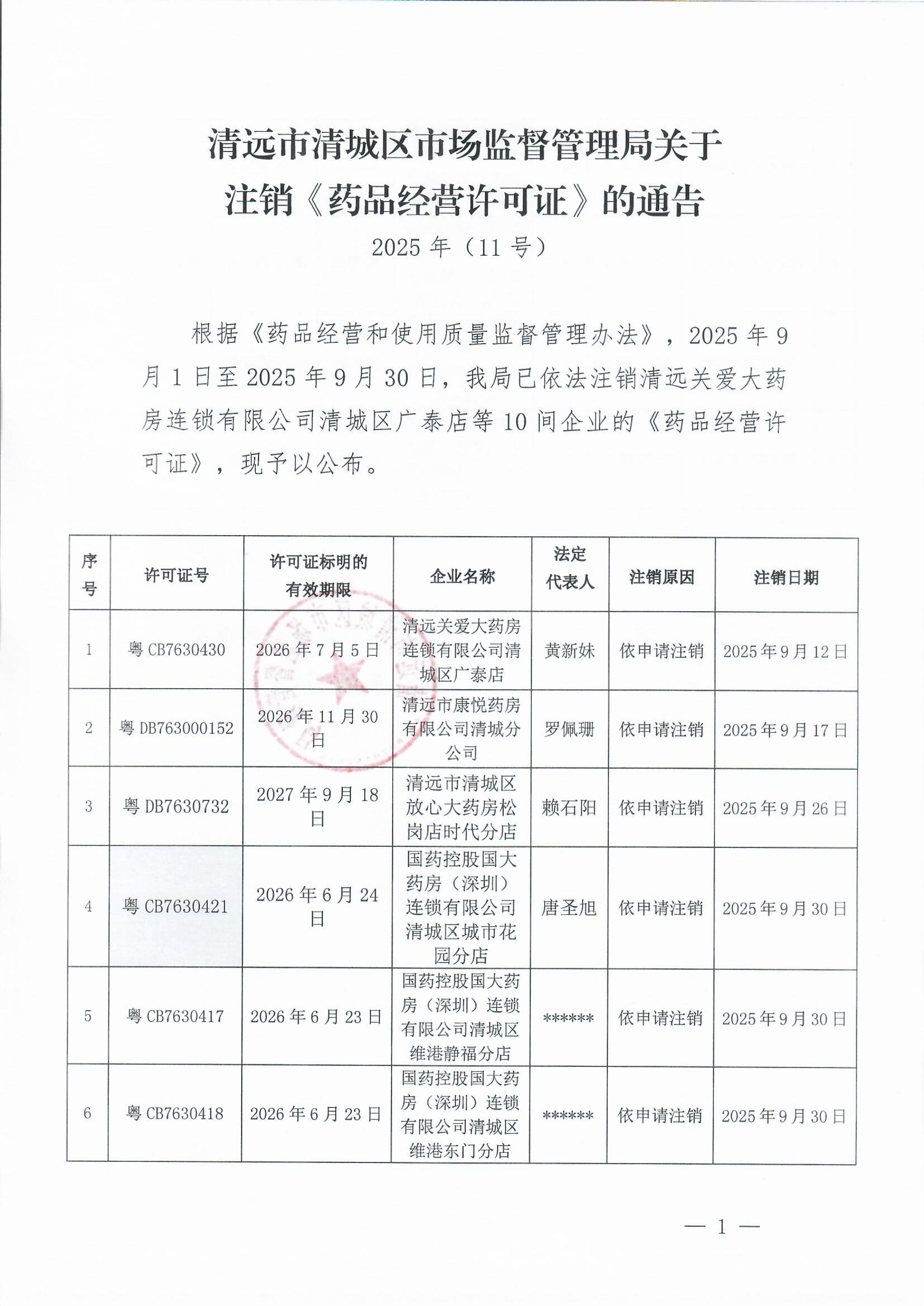 清遠(yuǎn)市清城區(qū)市場監(jiān)督管理局關(guān)于注銷《藥品經(jīng)營許可證》的通告(2025年(11號))
