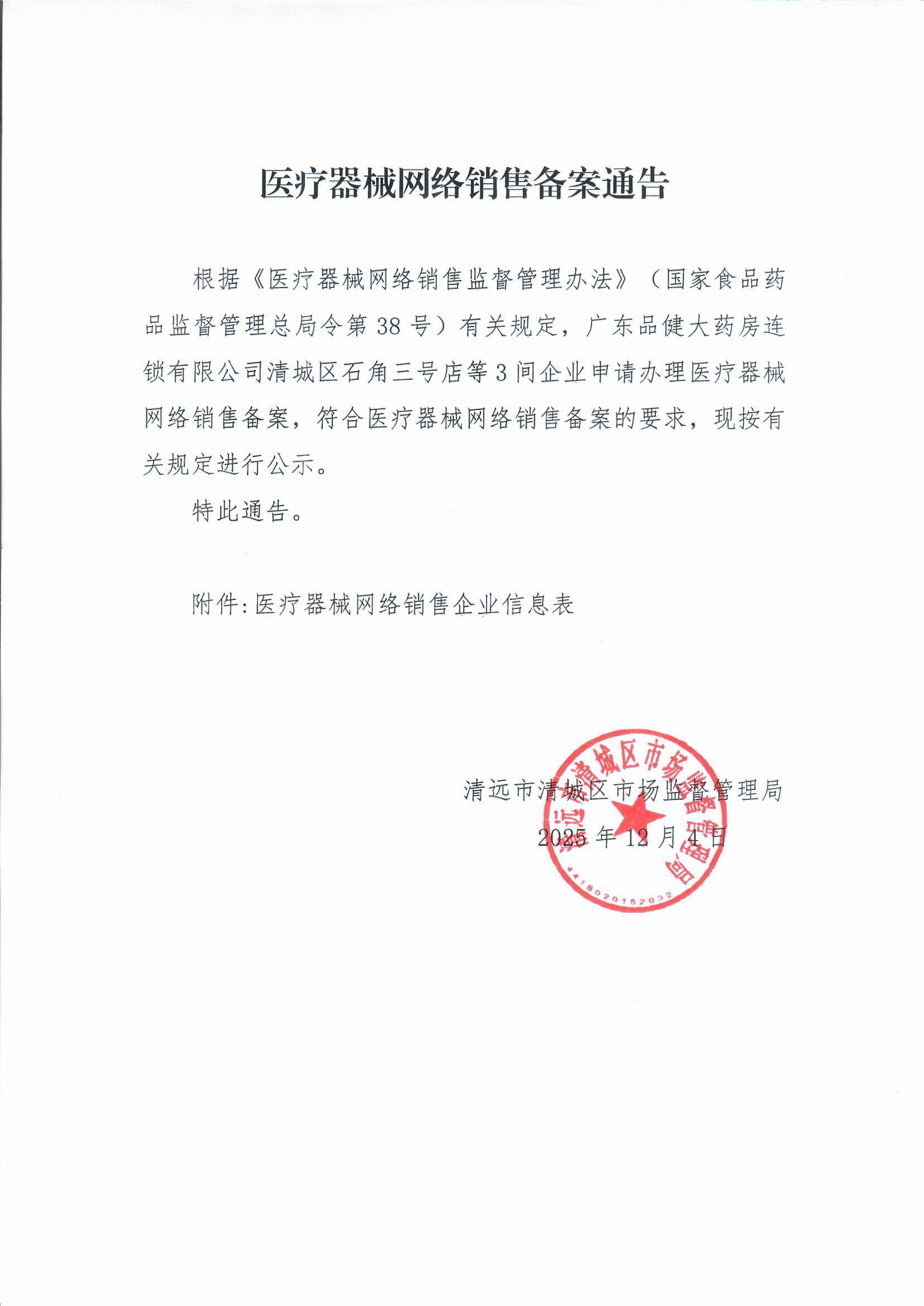 2 | 首次備案 | (清城)網(wǎng)械銷售備字 ﹝2025﹞第48號 | 2025/12/1 | 廣東品健大藥房連鎖有限公司清城區(qū)石角三號店 | 入駐類 | 91441802MADE68W87E | 清遠市清城區(qū)石角鎮(zhèn)福源街一幢第三號、東十二幢188號 | ****** | 抖店、抖音電商;京東到家;餓了么;美團網(wǎng);拼多多商城;天貓 | (滬)網(wǎng)械平臺備字[2022]第 00002 號;(滬)網(wǎng)械平臺備字[2018]第 00002 號;(滬)網(wǎng)械平臺備字[2018]第 00004 號;(京)網(wǎng)械平臺備字(2018)第 00004 號;(滬)網(wǎng)械平臺備字[2018]第 00003 號;(浙)網(wǎng)械平臺備字[2018]第 00002 號 | 無 | 無 | 無 | 無 | 無 | 無 |